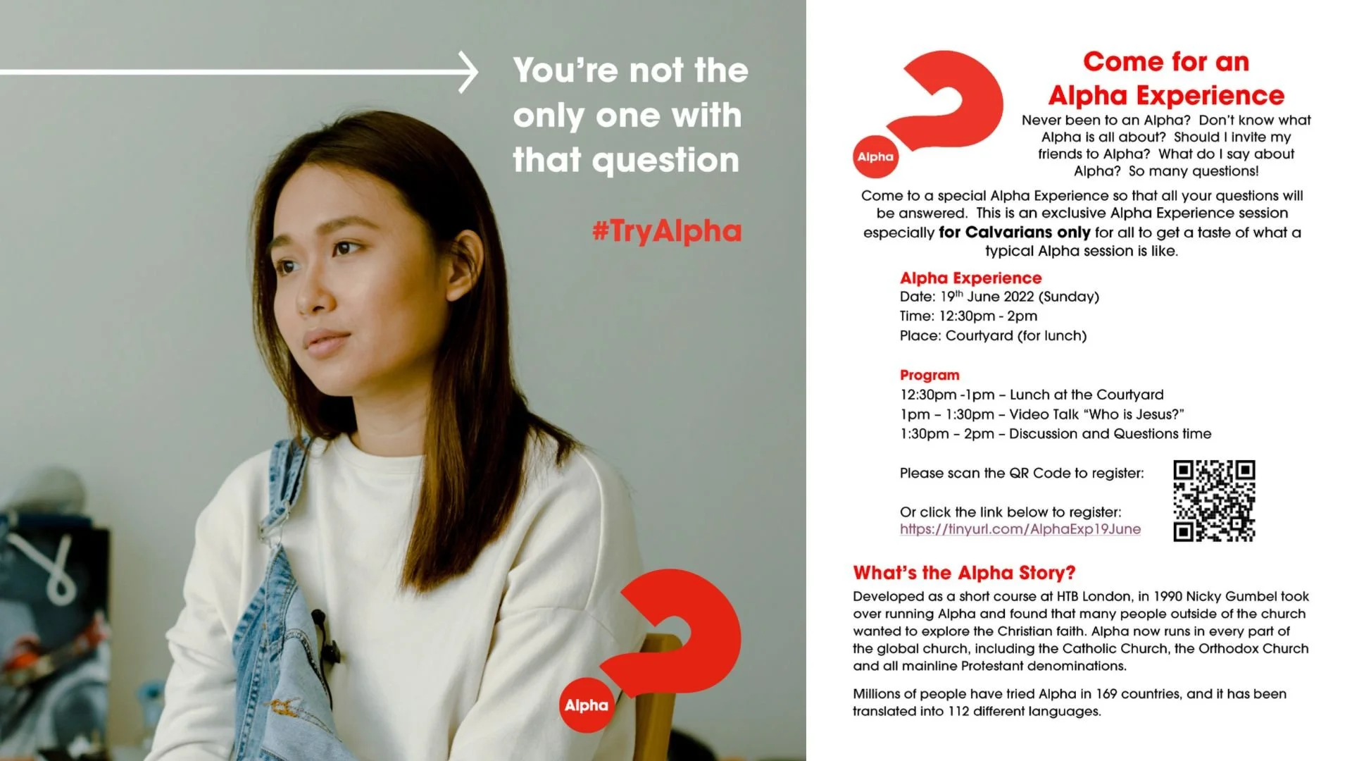 Come to a special Alpha Experience so that all your questions will be answered. This is an exclusive Alpha Experience session especially for Calvarians only to get a taste of what a typical Alpha session is like.