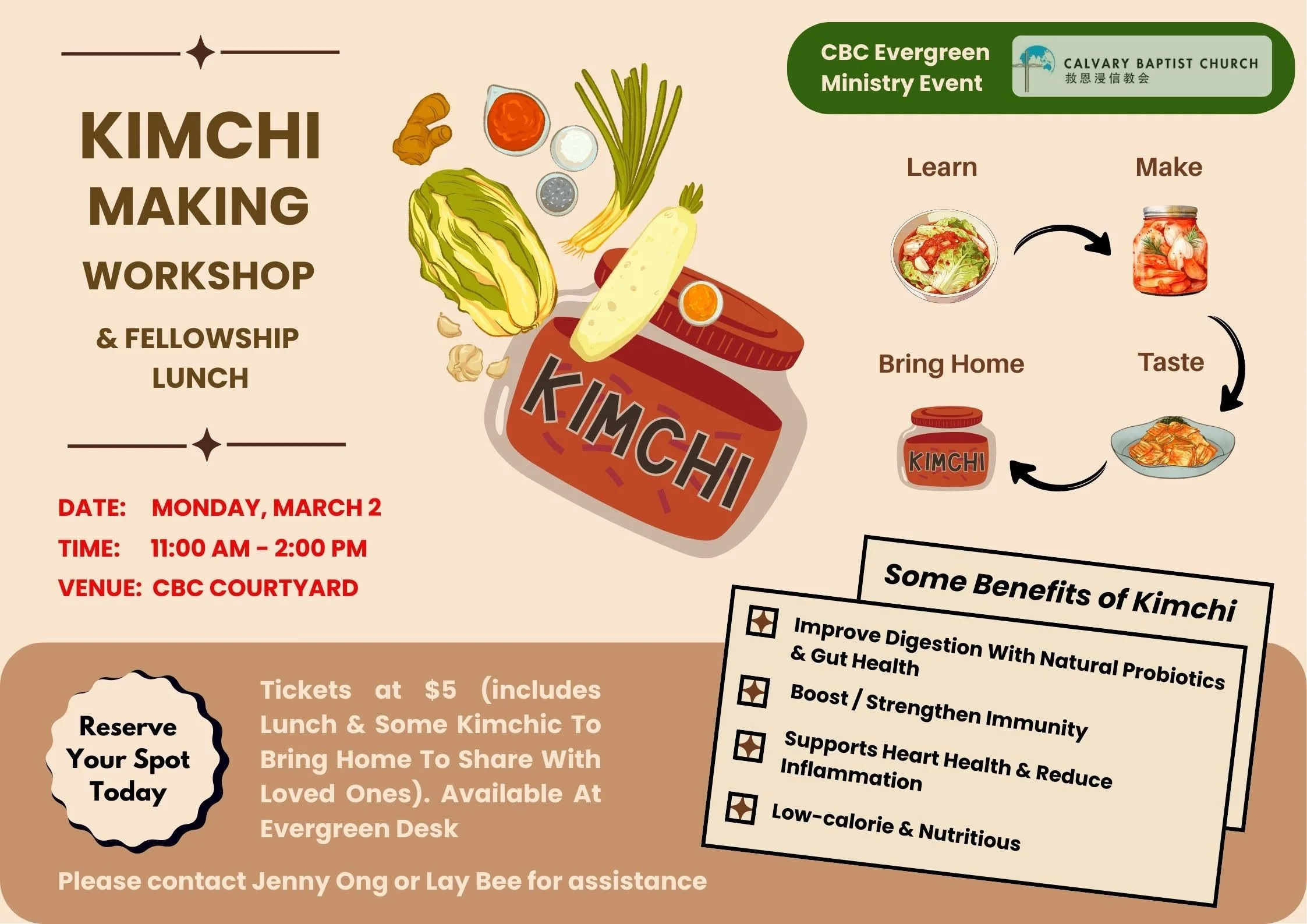 Join us for a fun and hands‑on Kimchi Making Workshop, followed by a cosy fellowship lunch! Learn the basics of traditional kimchi, understand the fermentation process, and make your own batch to bring home.